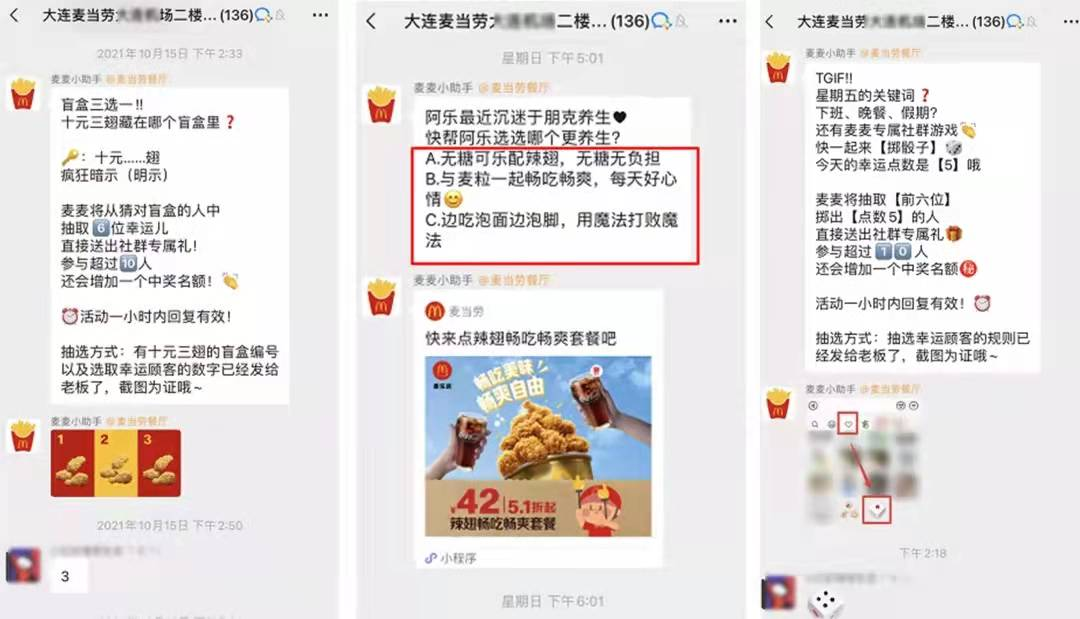 比如麦当劳,消费者刚进群,麦麦小助手就会@你入群有专属福利,并且详细地说明福利的种类、时间等,督促用户时刻关注群。同时用海报的形式,把福利具象化,给用户建立一个预期。