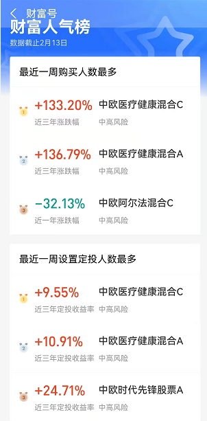 不过,虽然从支付宝的“周热销TOP”榜单中消失,但中欧基金在支付宝的榜单显示,中欧医疗健康C/A仍是最近一周购买人数最多的基金,仍是最近一周设置定投人数最多的基金。