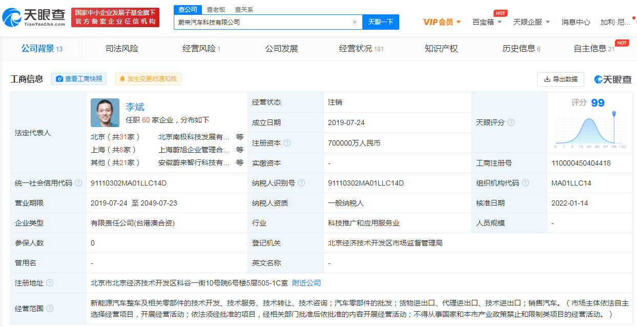 据天眼查App显示,近日,蔚来汽车科技有限公司注销,注销原因为决议解散。该公司成立于2019年7月,注册资本70亿元,经营范围含汽车零部件的批发,新能源汽车整车及相关零部件的技术开发等。股东信息显示,该公司由NEXTEV LIMITED、NEXTEV USER ENTERPRISE LIMITED共同持股。