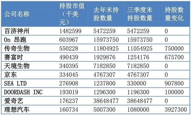 前十大重仓股依次为:百济神州、昂跑(ON HOLDING)、传奇生物(Legend Biotech)、赛富时、天境生物、京东、SEA、DoorDash、爱奇艺、理想汽车。总起来看,6只中概股,其余4家公司为海外企业。