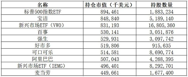 前十大重仓股:前十大重仓股集中度为89.54%。第一大重仓股仍然是苹果公司,持仓数量维持8.87亿股、市值1575.29亿美元,占披露持仓总规模的47.6%。第二到第五大重仓股依然是美国银行、美国运通、可口可乐和卡夫亨氏,持股数量分别为10.1亿股、1.52亿股、4亿股和3.26亿股,市值分别为449.39亿美元、248.04亿美元、236.84亿美元和116.9亿美元。