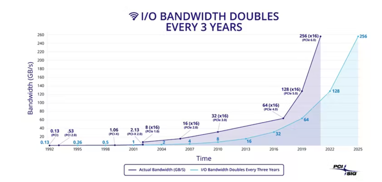 PCI-SIG的路线图曾表示,I/O带宽每三年会翻倍。但是,PCIe的技术快速迭代并没有带来PCIe的市场需求,目前市场进步已经远远滞后于技术。