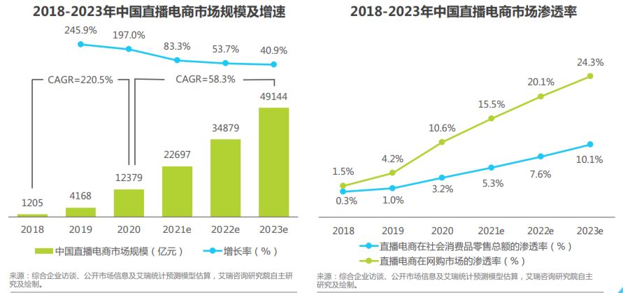 即便内容社区转电商还没有成功的先例,但这也是没有选择的选择,而直播电商的火热,在推高电商天花板的同时,也进一步提升了流量转化的效率。根据艾瑞咨询《2021年中国直播电商行业研究报告》,2020年中国直播电商市场规模超1.2万亿元,预计2023年超过4.9万亿元。