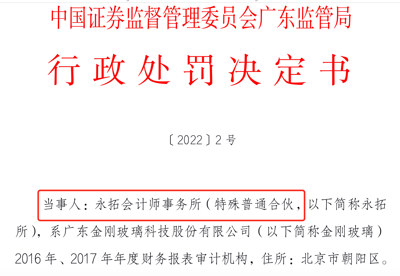 界面新闻注意到,被换下的永拓所在节前刚领了罚单。广东监管局2022年2号行政处罚决定书显示,永拓所是金刚玻璃(300093.SZ)2016年、2017年年度的财务报表审计机构,相关签字注册会计师包括吕润波、张群、张虹。决定书显示,在2016年、2017年的年报中,金刚玻璃存在虚增收入、虚增货币资金等虚假记载行为。2017年4月28日、2018年4月24日,永拓所分别为金刚玻璃2016年、2017年财务报表出具了标准无保留意见的审计报告。经查,永拓所出具的前述审计报告存在虚假记载。