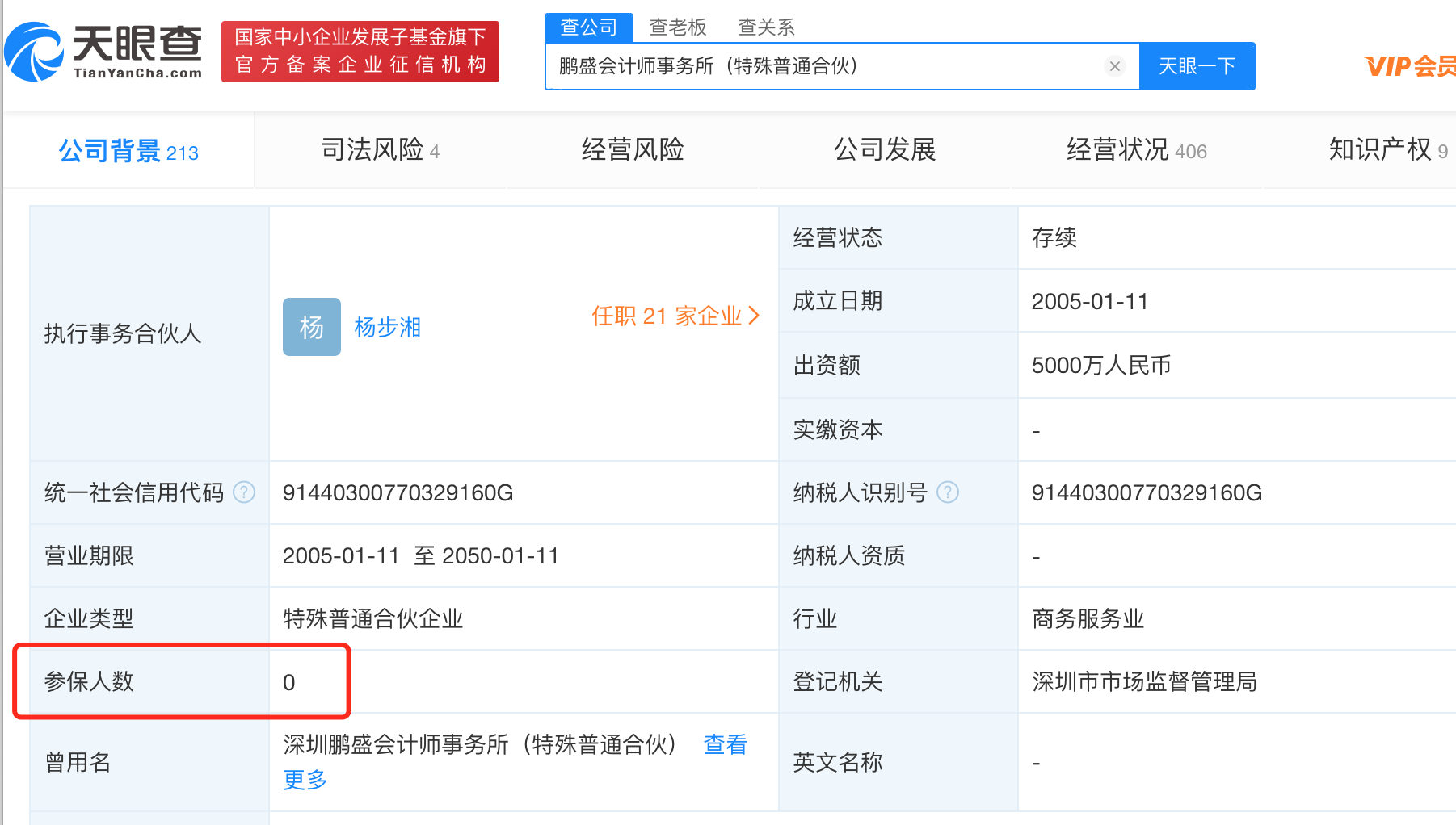 还有一点值得注意,从披露来看,鹏盛所合伙人数量为70人,注册会计师人数为344人。但通过天眼查可以看到,鹏盛所的参保人数为0,那么公告所述合伙人数量、注册会计师人数是否真实、准确,自然也成疑。