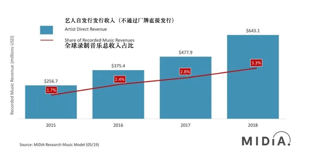 市场研究机构Midia Research2019年发布的报告《独立音乐人的赋能时代》称,2015年以来,音乐人自发行收入快速增长。2018年,全球独立音乐人自发行收入达到6.431亿美元,比2017年增长了34.6%,是2015年的2.5倍。
