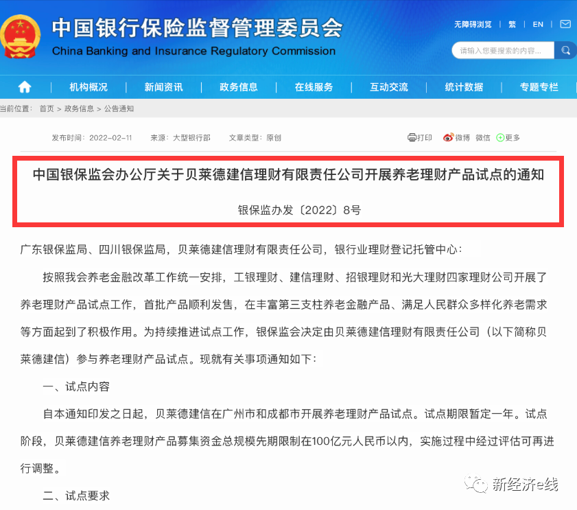 今年2月11日,中国银保监会发布《关于贝莱德建信理财有限责任公司开展养老理财产品试点的通知》(下称《通知》),明确贝莱德建信理财有限责任公司(贝莱德建信)参与养老理财产品试点,试点城市为广州和成都,试点期限为一年,募集资金总规模先期限制在100亿元人民币以内,实施过程中经过评估可再进行调整。
