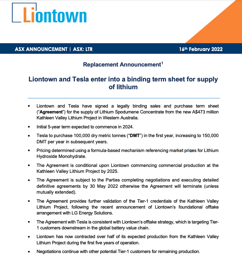 2月16日,澳大利亚锂矿商Liontown Resources宣布,已与特斯拉签署了一项五年期协议向其供应锂辉石精矿,预计将于2024年开始。根据协议,特斯拉将第一年采购10万干公吨(DMT)的锂辉石精矿,并在随后的几年增加到每年15万干公吨。Liontown将从其位于西澳大利亚的Kathleen Valley锂矿项目供应锂矿石,该项目预计将在2025年之前商业化生产。
