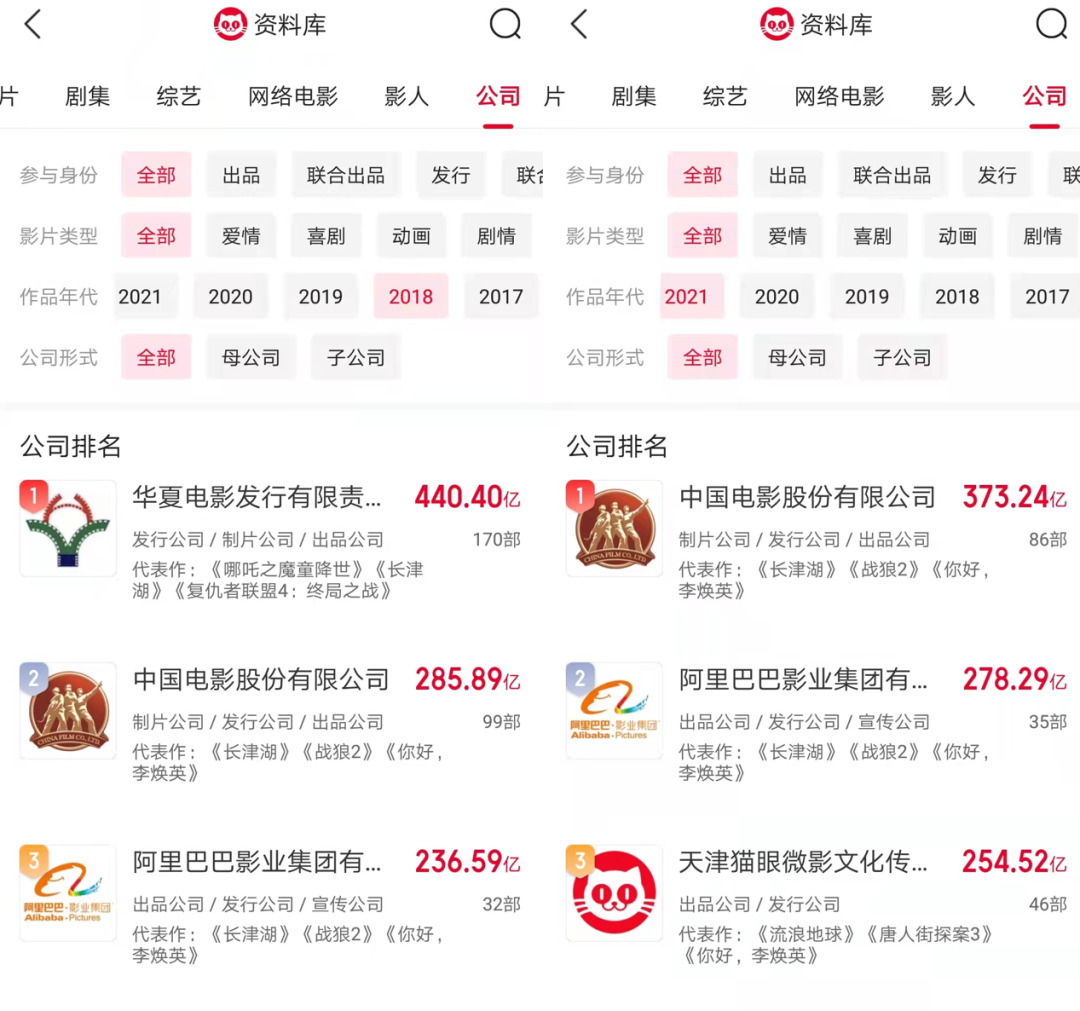 猫眼数据显示,2018年-2019年,中影在年度内参与的所有影片累计票房分别达到285.89亿和294.06亿,相对应地,公司同期的年度净利润分别达到14.95亿、10.61亿。相比之下,中影在2021年预计净利润不足3亿,而其在同期参与的所有影片累计票房则高达373.24亿。