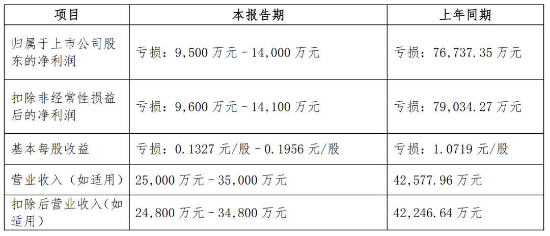 业绩:报告期内,预计归属于上市公司股东的净利润为亏损0.95亿-1.4亿元,较上年同期7.7亿的亏损额有所收窄。