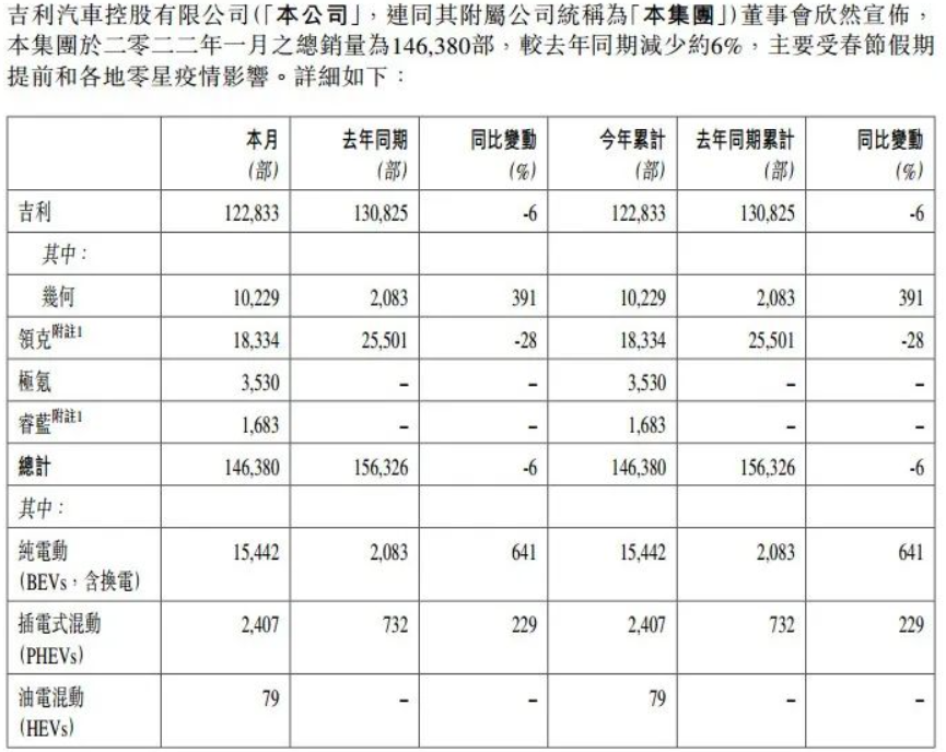 其中,领克品牌销售18334辆,2021年同期销售25501辆,同比减少28%。