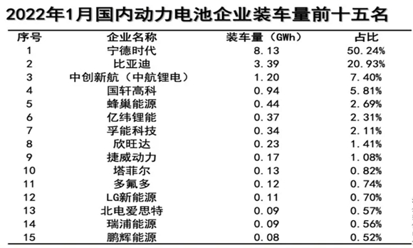 2月16日,中国汽车动力电池产业创新联盟(下称动力电池联盟)发布最新统计数据。今年1月,国内装车量排名前五的动力电池企业,分别为宁德时代、比亚迪、中创新航、国轩高科(002074.SZ)和蜂巢能源。