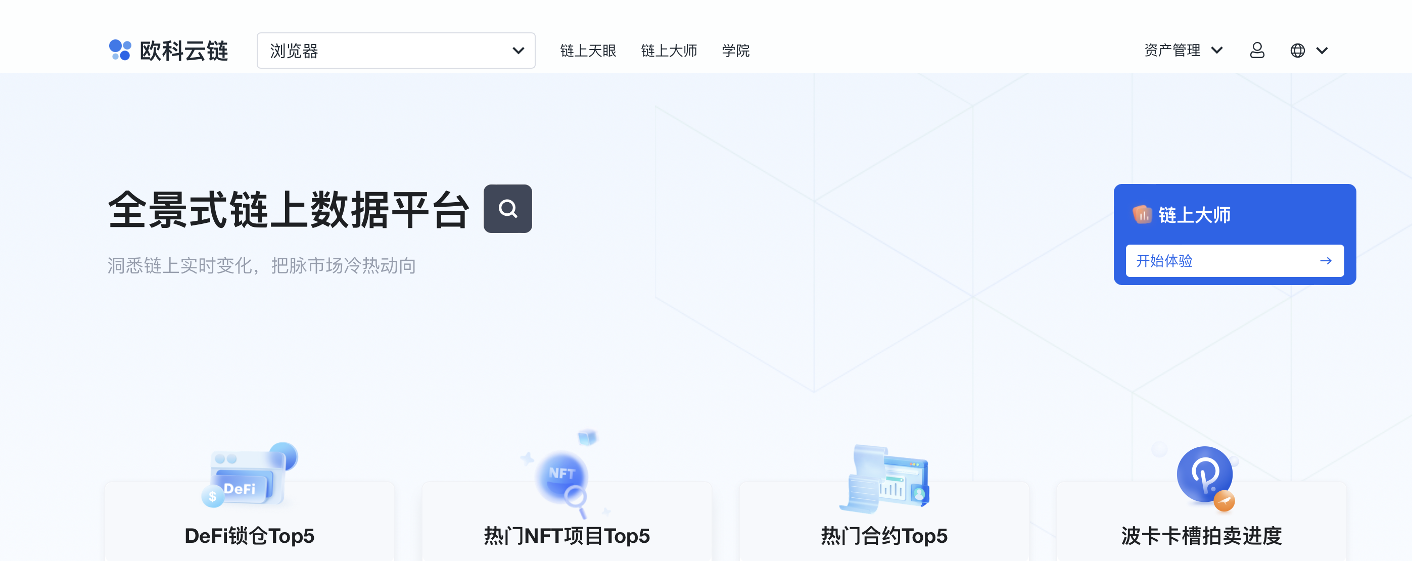 欧科云链链上大师是全球领先的“一站式链上大数据交互平台”,也是我国首款全景式链上数据分析工具,为用户提供了10000+数据指标、多项热门专题数据、深度研报和专业API接口服务,以“全面、准确、即时”的数据图表在海内外广受好评,被多家媒体誉为“链上bloomberg”。