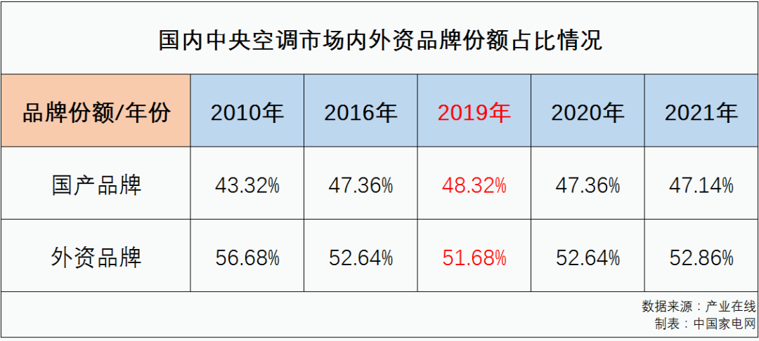 从整体中央空调市场格局来看,与大多数制造业趋同,国内中央空调业也经历着“外资垄断”到“合资并存”再到如今“国产发力”的发展趋势。早期国内企业技术储备相对不足,市场主要以欧美、日韩等外资品牌为主导,随着制冷技术、多联机以及小型水冷机的发展,新一代中央空调产品逐渐走进家用领域,国产家电品牌借此突破,市场份额持续增长,国产家电巨头也开始和国外品牌正面竞争,这从上文行业TOP5品牌格局就可见一斑。