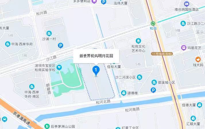 松风明月花园地处于沙江路和沙浦围工业大道的交汇处,距离它最近的地铁站是11号线的松岗站,同时该站也是6号线的目前的终点站,两地之间相隔不到500米。