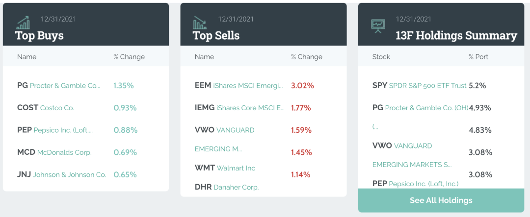 相较于2021年Q3,桥水大幅减持了新兴市场ETF。宝洁、百事、强生、好市多、可口可乐和麦当劳等美国消费股龙头获得不同程度的加仓。