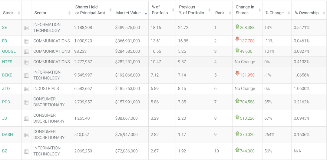 增持幅度显著的还有“东南亚小腾讯”SEA,增持90万股至123.78万股。SEA新晋为HHLR第七大重仓股。