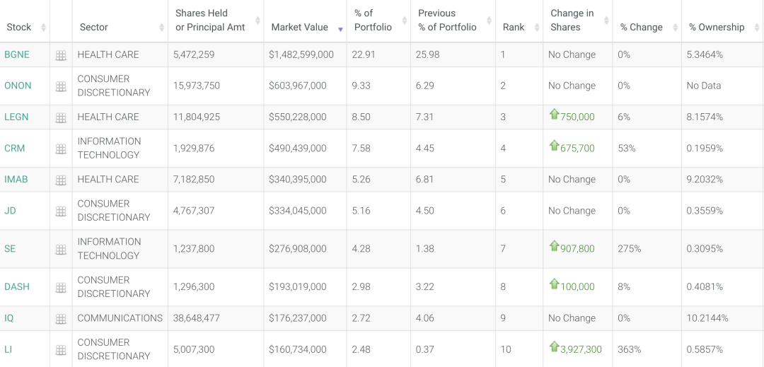 HHLR Advisors 最新的前十大重仓股为百济神州、On 昂跑、传奇生物、Salesforce、天境生物、京东、SEA、DoorDash、爱奇艺和理想汽车。