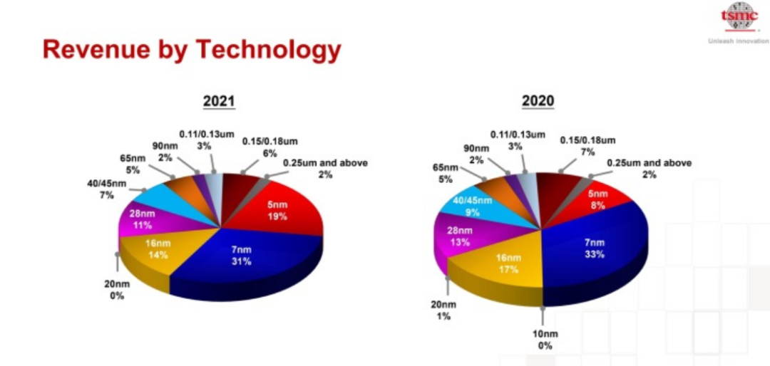 数据显示,代表当前晶圆代工最高水平的5nm和7nm先进制程晶圆,已经成为台积电主要营收支柱,产能大幅提升。从过去两个季度的财报来看,7nm制程晶圆代工是台积电最赚钱的业务,三季度营收占比高达52%。不过5nm制程晶圆的贡献率也在稳步提升中,过去两个季度占比分别为18%和19%,较去年同期几乎翻了一倍。