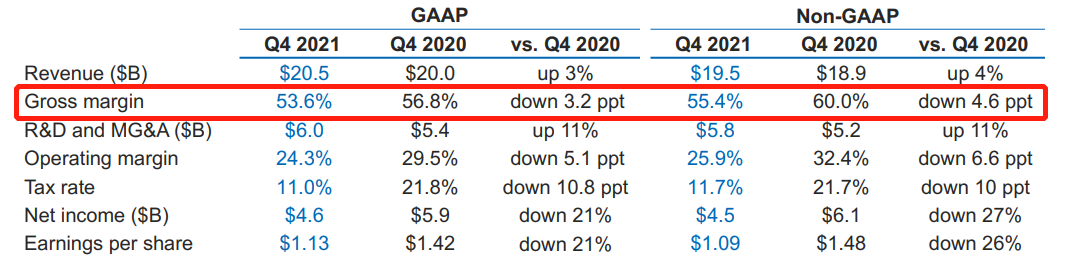 价值研究所(ID:jiazhiyanjiusuo)也观察到,综合华尔街多家顶级投行对高塔半导体2022年业绩预期来看,其毛利率预计不会高于30%。而过去几个季度,英特尔的毛利率都不低于50%,四季度的最新数据是55.4%——这还是在同比下滑4.6%的情况下取得的成绩。