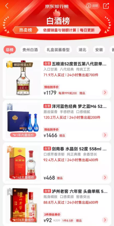 低端白酒之所以没有在电商平台进入热销榜的前三,可能和这些榜单设计有关系,或者与品牌效应以及销售模式等有关系,但市场聚焦高端酒这一趋势实际是在加强的。