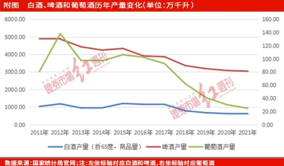 据国家统计局数据显示,白酒产量峰值是在2015年,年产量为1211.40万千升,此后便开始走“下坡路”,在2016年~2021年,白酒产量分别为1157.90万千升、1158.60万千升、790.60万千升、679.80万千升、629.70万千升和617.60万千升。对比来看,去年的白酒产量较2015年的峰值缩水49.02%,接近腰斩。啤酒、葡萄酒等其他酒类也遭遇了相似的情形(见附图)。