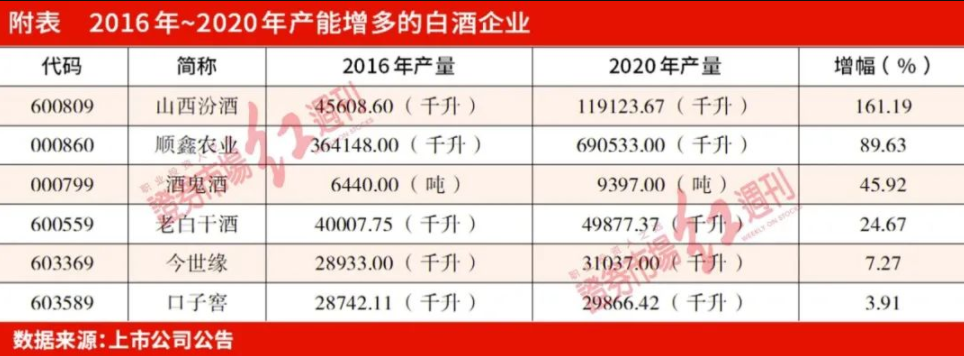 除茅台和五粮液以外,其他酒企也在“照此办理”。据《红周刊》记者统计,在2016年~2020年期间,酒类总体产能或者产量增多的上市酒企还有山西汾酒、顺鑫农业和酒鬼酒等6家(见附表)。