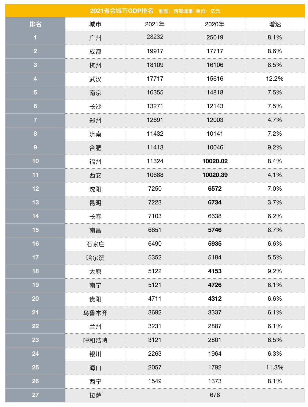 但实际上,2021年,不只有昆明的排名发生变化,全国27座省会(首府)城市的整体格局,都在经历一定程度的洗牌。