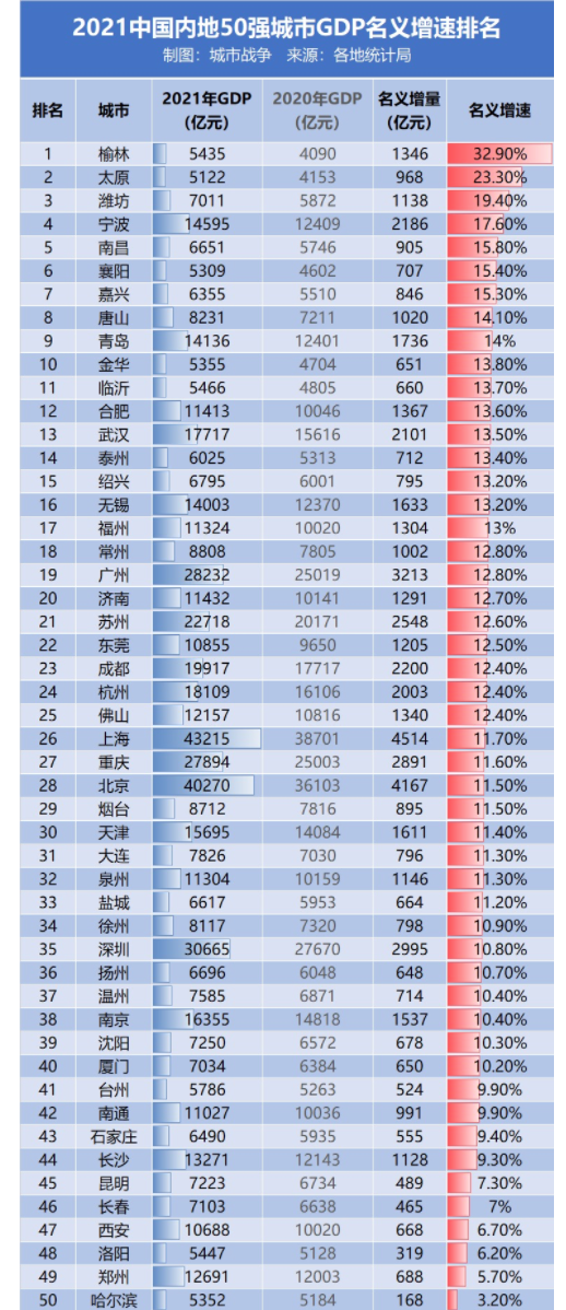比如太原,作为能源大市,主要受能源价格的飙涨,名义增速高达23.30%,在全国仅次于榆林。这也使得它的GDP名义增量高达1346亿元。