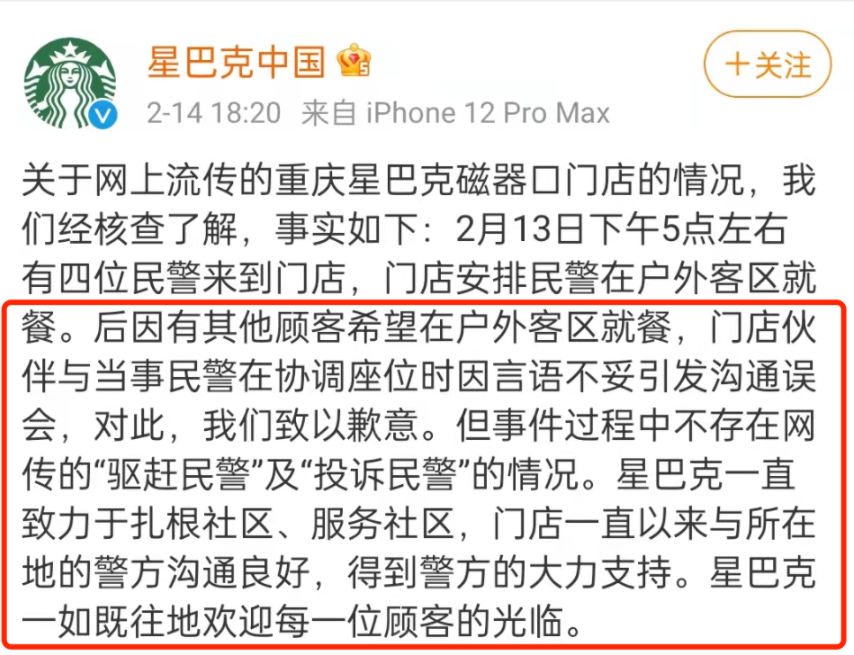 迫于舆论压力,星巴克中国于2月14日晚间发布微博回应称,经核查了解,因有其他顾客希望在户外客区就餐,门店伙伴与在外用餐的民警在协调座位时因言语不妥引发沟通误会,对此,我们致以歉意。