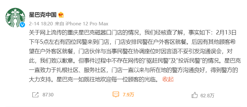 2月13日,有网友发微博称,重庆一星巴克赶走在门口吃盒饭的民警还恶意投诉。随后,与该事件相关的讨论便层出不穷,激起网友愤怒的同时也引起了星巴克的关注。