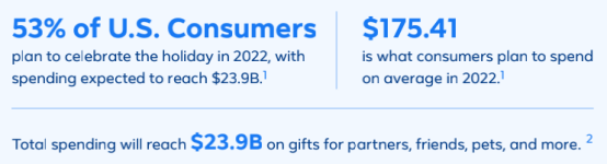 据NRF(全国零售联合会)调查显示,在2022年,53%的美国消费者计划庆祝这个节日,预计消费将达到239亿美元,而消费者为情人节计划的平均花费为175.41美元。这也是2022年的情人节成为NRF自2007年开始该统计以来花销第二高的年份。消费力的大幅度提升正说明着营销的重要性。