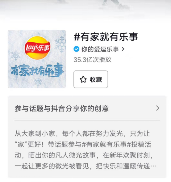 “有家就有乐事”,今年的春节乐事是真真切切的把温暖传递到了每一个人,它用基层平民的视角出发,拍摄的宣传片被推上了热门,并在抖音引发无数原创者翻拍,在抖音平台这个话题高达35.2亿次播放,甚至央视新闻也进行了翻拍创作。