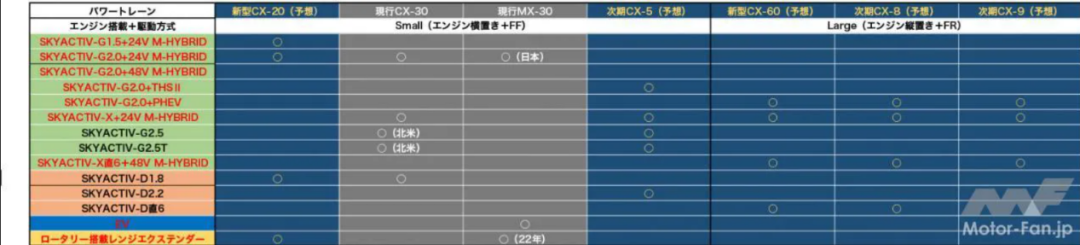 排放相对自由的北美,马自达会提供涡轮增压直列六缸发动机、插电混合动力,日本本土会引进直列六缸柴油发动机以及插电混合动力。针对CX-50,马自达会追加丰田THS II混合动力系统的版本。