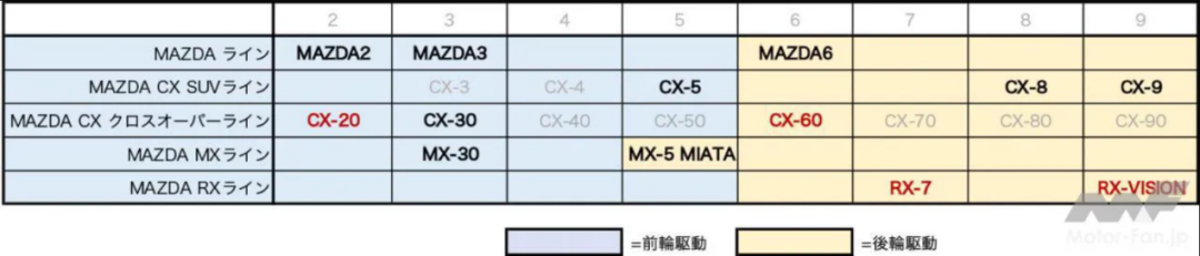 不过,为了提升品牌价值和产品定位,马自达将产品阵容重新划分为小型车群和大型车群两套产品阵容存在。事实上,可以理解为马自达将前驱车和后驱车做了人为上的划分,以区别当下的马自达和未来的马自达。