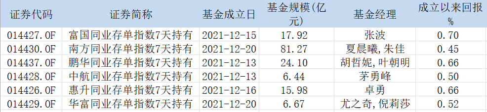Wind数据显示,6只同业存单指数基金自去年12月份成立以来,至今的回报率均为正。其中,富国同业存单指数基金成立以来回报率最高,为0.7%。南方同业存单指数基金成立以来回报率最低,为0.45%。