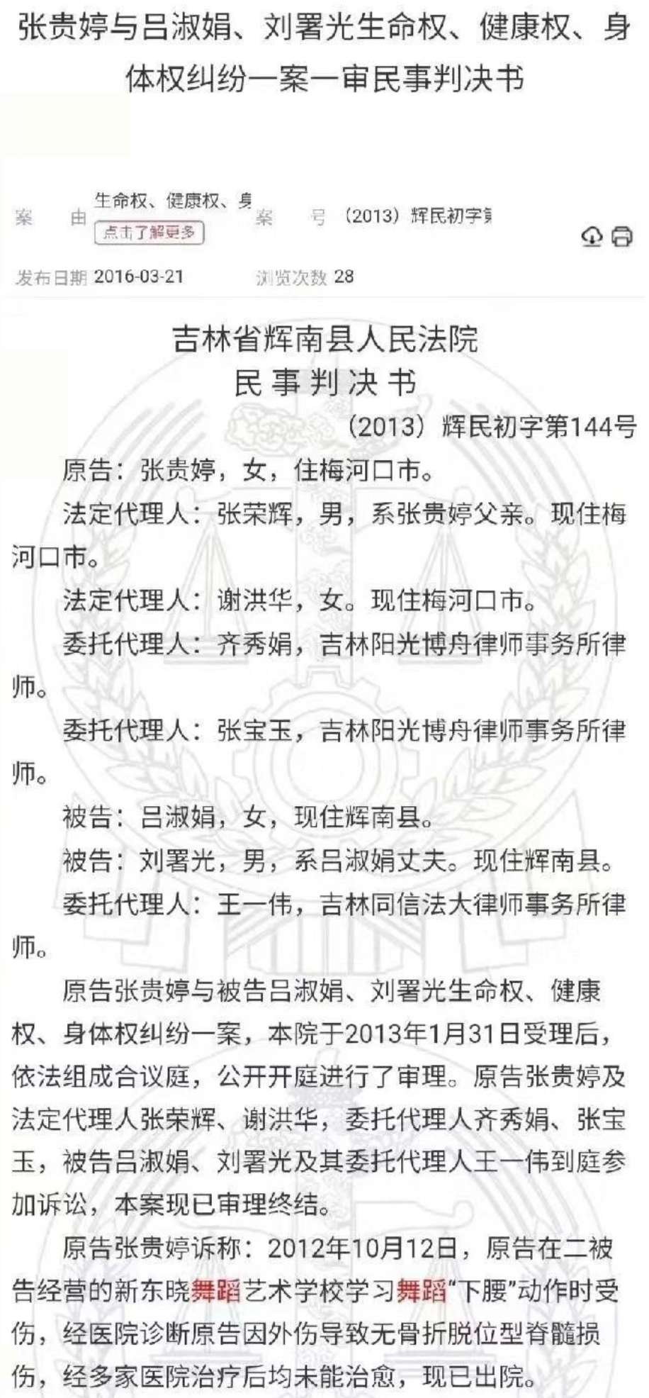 2012年10月12日,一位名叫张贵婷的女孩在吕淑娟、刘署光(刘浩存父母)经营的新东晓舞蹈艺术学校学习“下腰”动作时受伤。根据鉴定意见,认为张贵婷损伤构成一级伤残且与舞蹈学校的外伤存在因果关系,判决吕、刘二人赔偿张贵婷1137089.5元。