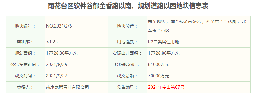 2021年9月26日,G75地块被龙湖以成交总价7亿竞得,楼面价31587元/㎡,未来毛坯限价约43000元/㎡。