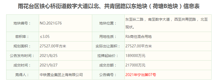 2021年9月26日,铁心桥G76地块经过23轮竞价触顶待摇号,预计217000万元成交,楼面地价25846元/㎡;9月27日,中铁摇中铁心桥G76地块,楼面价约25846元/㎡,未来毛坯限价约38500元/㎡。