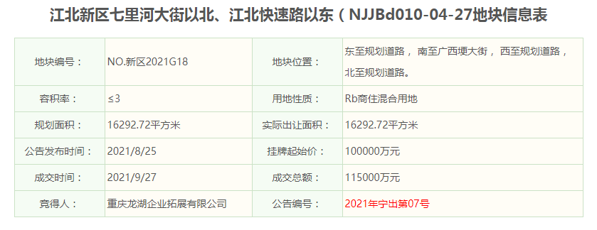 2021年9月26日,NO.新区2021G18地块经过15轮竞拍达到最高限价,触顶待摇号。2021年9月27日,最终摇号被龙湖拿下,成交总价11.5亿,楼面价约23528元/㎡,未来毛坯限价约35000元/㎡。