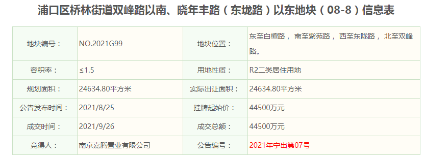 2021年9月26日,NO.2021G99地块经过1轮竞拍,被南京嘉腾置业有限公司(龙湖)底价拿下,成交总价44500万,楼面价约12043元/㎡,未来毛坯限价约24500元/㎡。