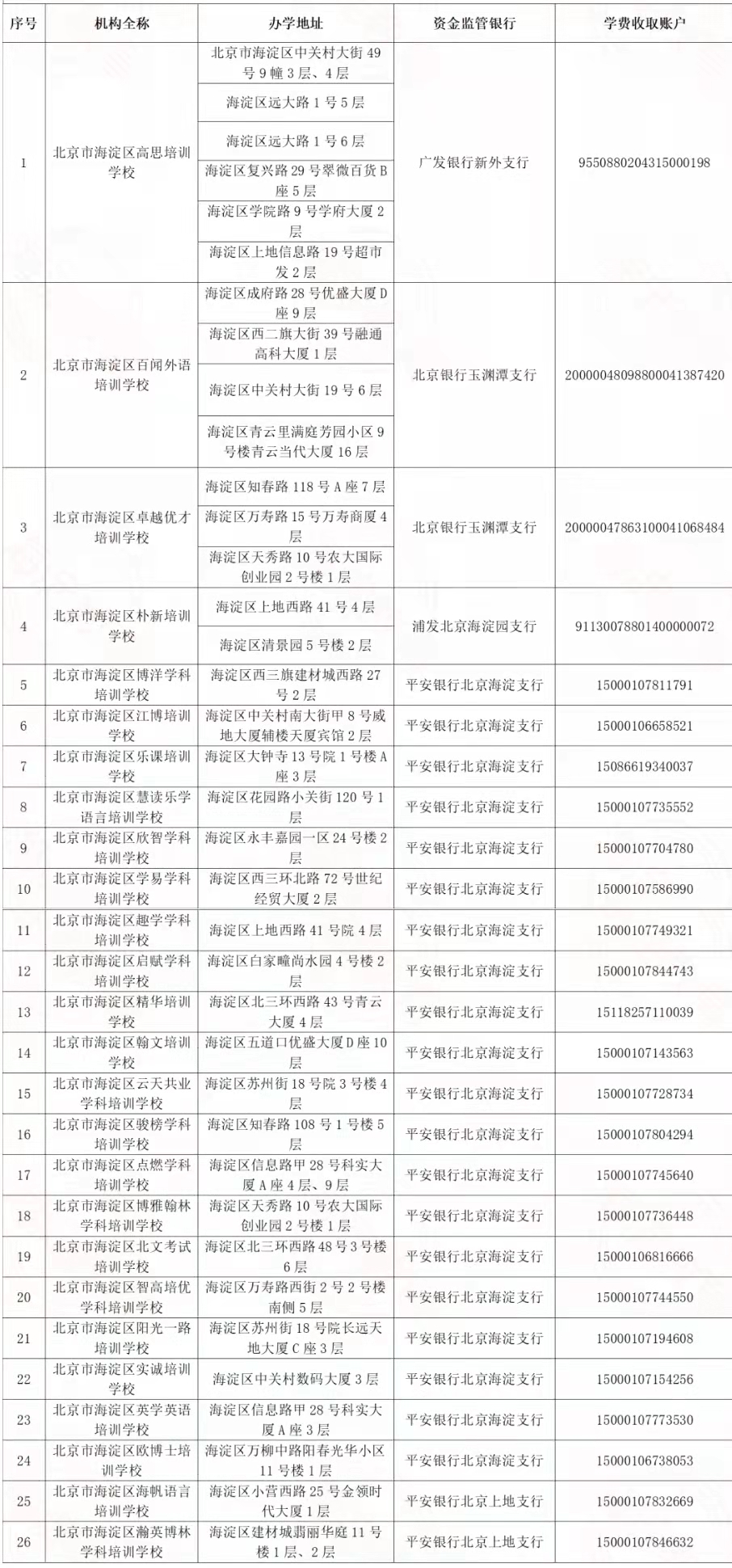 1月27日,海淀区“双减”工作专班办公室公示26家学科校外培训机构的收费账号,高思、朴新教育、卓越优才在内。这批机构已完成收费备案审核,并计划在今年2月21日—4月30日开班。海淀教委警示,未在名单内的学科类校外培训机构在此期间不得收费。家长和学员须审慎选择学科类校外培训机构,核验证照是否齐全,并核对收费账户和账号信息,不要账外缴费,避免损失。