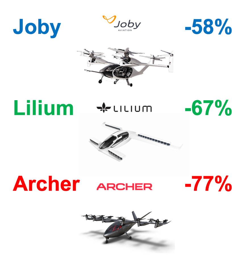 Joby, Lilium和Archer这三家赛道中的明星企业平均跌幅更是高达67%。