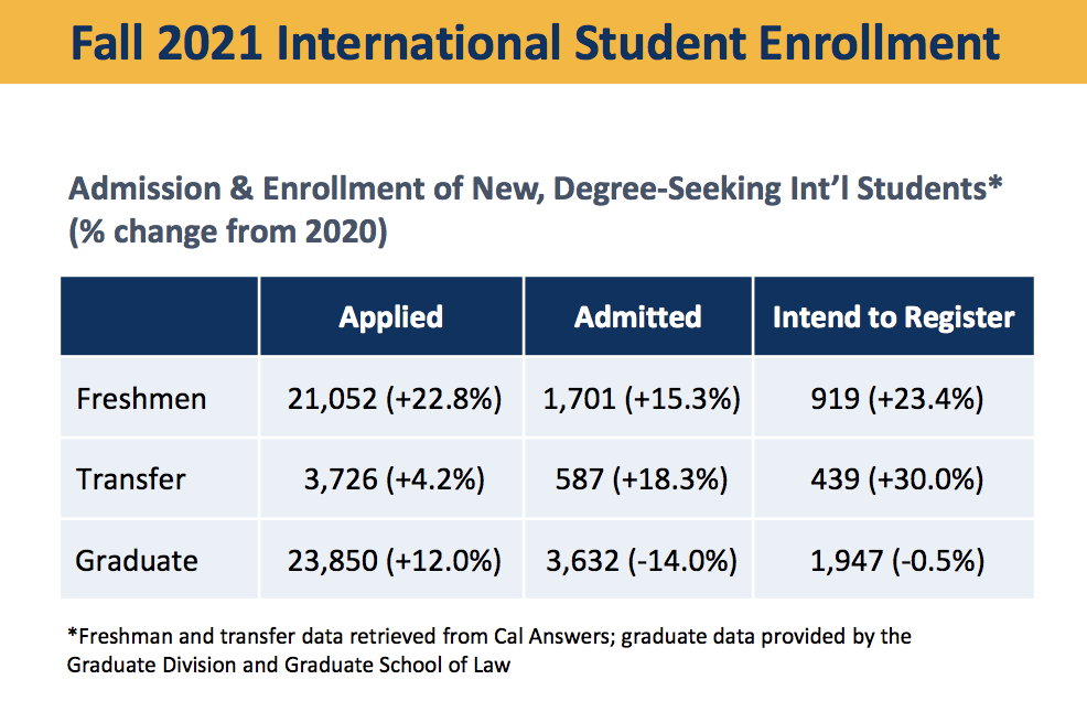 整个加州大学系统近年来的招生扩张十分猛烈。2010年秋季,加州大学系统招收13195名国际学生,这个数字在2019年秋季飙升至41085人。