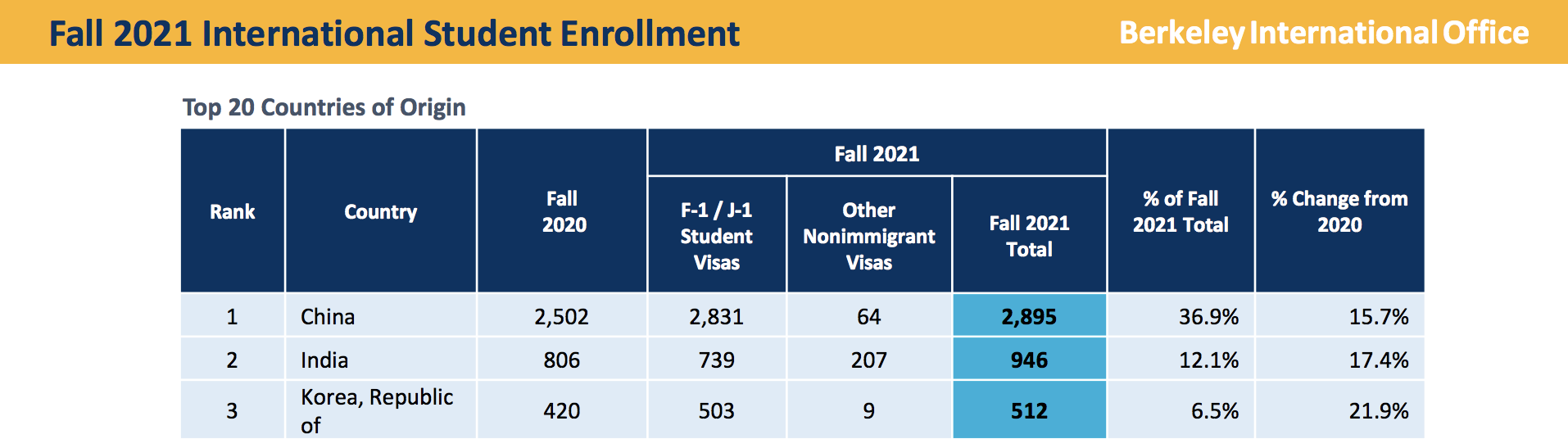 以伯克利为例,2021年秋季学期,中国是国际学生最多的来源国,占比达36.9%,其次是来自印度和韩国的学生,占比分别为36.9%和12.1%。