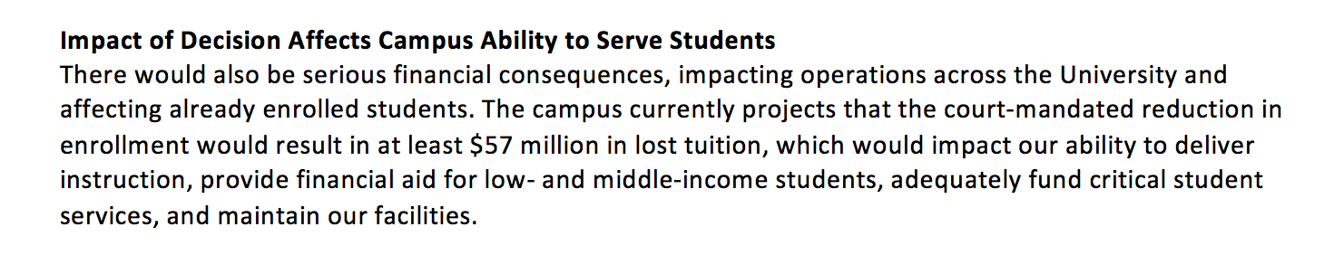 在日前另一份声明中,伯克利表示,来自于当地法院的这一判决对于成千上万努力想要进入伯克利的学生来说是一个灾难性的结果。同时,新生的大幅减少将使学校的财政大幅缩减5700万美金。