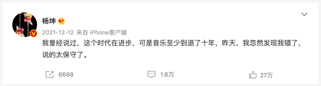 榜单发布次日,歌手杨坤就发微博称“我曾经说过,这个时代在进步,可是音乐至少倒退了十年,昨天,我忽然发现我错了,说的太保守了。”音乐人们和大众纷纷附和感慨,对华语乐坛颇有“哀其不幸、怒其不争”的意味。