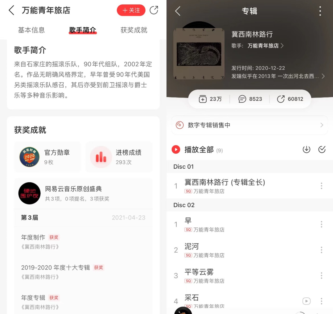 2020年底,蛰伏十年的乐队万能青年旅店,在网易云音乐发布第二张专辑《冀西南林路行》,豆瓣评分9.2,不仅拿到网易云专辑日榜top2,开售1周销量突破40万张,截止2021年年底,总销售额突破1320万元。
