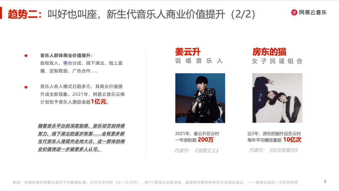 根据网易云音乐最近发布的《华语乐坛趋势报告(2022)》,截至21年上半年,网易音乐人总数超30万,较2016年11月石头计划发起时增长15倍。
