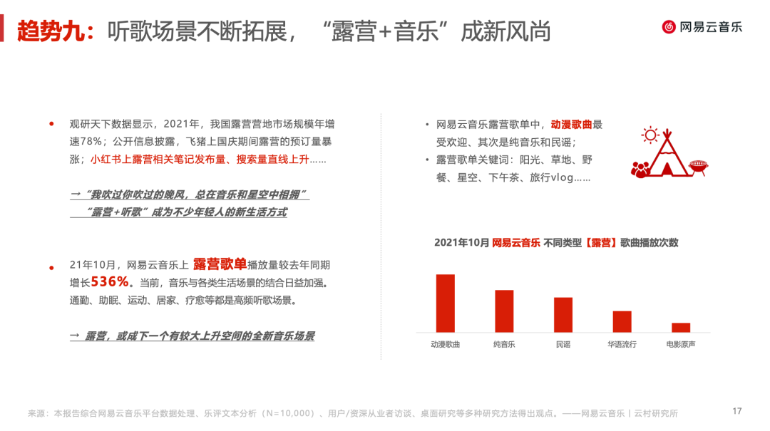 而在线下,疫情虽然阻隔了音乐节的开展,但遍布各大城市的livehouse,也给予新的音乐人更多展示空间,让年轻人们聚集在一起狂欢。此外,远途旅行的受限,也间接带火了露营这一周边游的消费形态,“露营+音乐”成为了新风尚,2021年10月,网易云音乐露营歌单播放量较去年同期增长536%。